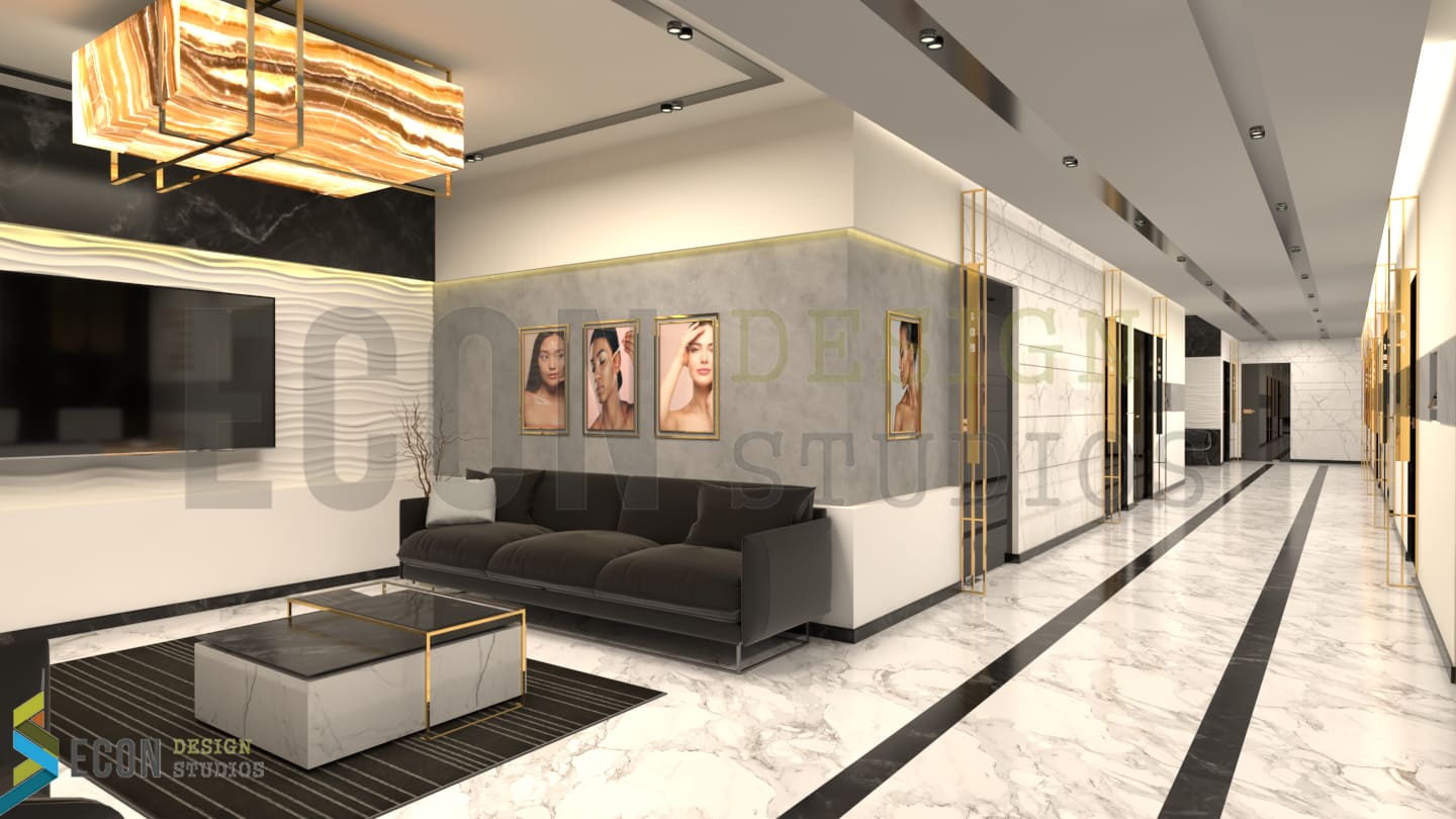 The entrance lobby is dominated by full length white marbled reception desk floating on gold plated metal frame making it look weightless becoming an eye-catching centrepiece.